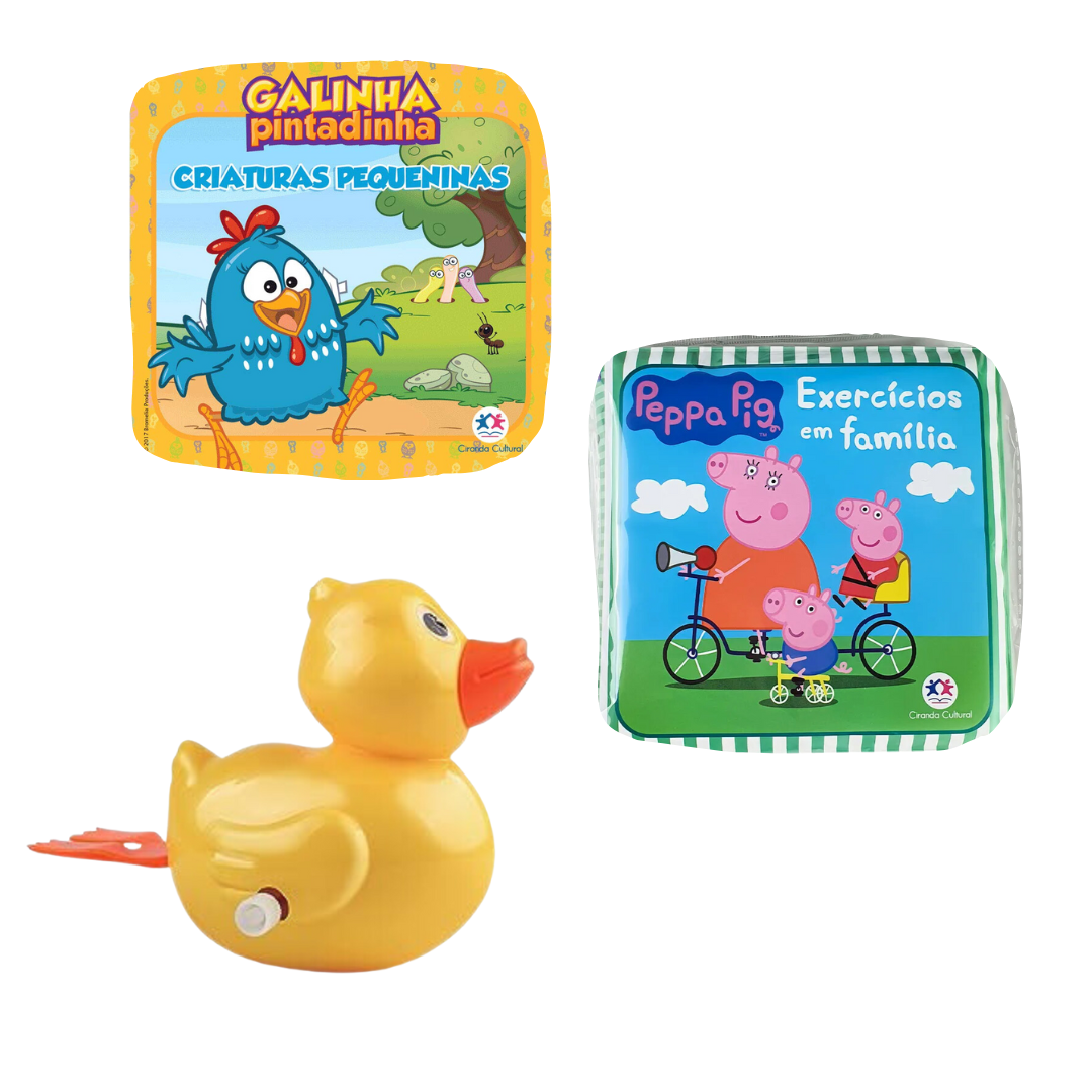Kit 3 Peças Brinquedos de Banheira Bebê Infantil - Livrinho e Patinho de Banho (Pato de corda, Galinha Pintadinha e Peppa Pig)